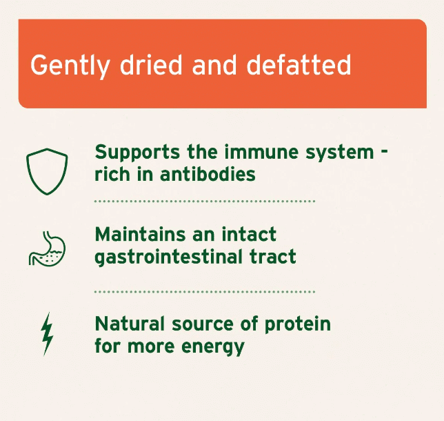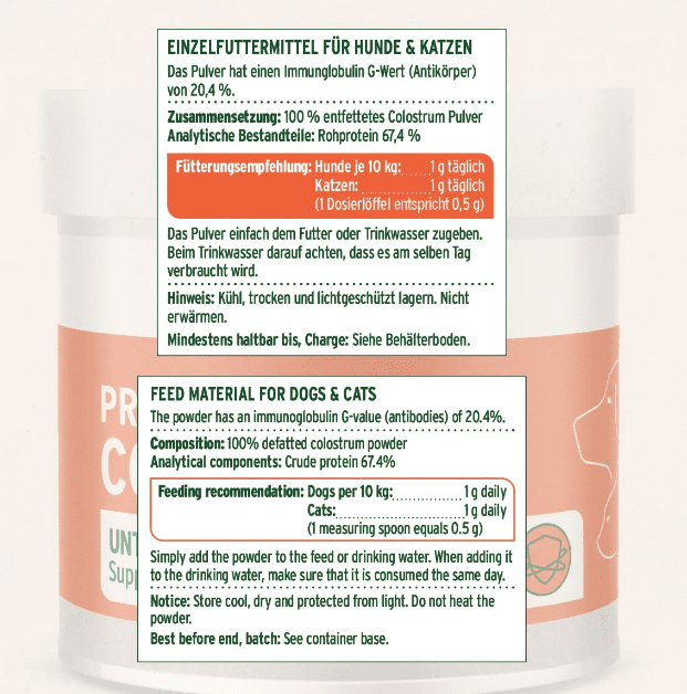 Recent research has shown that colostrum is valuable in helping balance the vitals, primarily serving to naturally regulate the immune system. The natural composition ensures problem-free digestion and optimum utilisation in cats and dogs. It is filled with essential vitamins, essential and non-essential amino acids, as well as indispensable immune regulators, such as Lactoferrin and PRP (proline-rich polypeptides).
