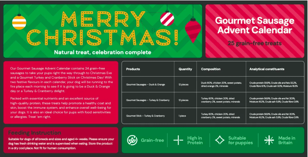 Christmas Home / Christmas / Gourmet Sausage Advent Calendar Gourmet Sausage Advent Calendar Gourmet Sausage Advent Calendar £11.99 RRP: £13.38 Stock Status: In Stock You Will Earn 11 points with this purchase Add to your Wish List Information Specifications Reviews Our 2025 Gourmet Sausage Advent Calendar contains 24 grain-free sausages to take your pups right the way through to Christmas Eve and a Gourmet Turkey and Cranberry Stick on Christmas Day! With two festive flavours in each calendar, your dog will be running to the fire place each morning. Packed with essential nutrients and an excellent source of high-quality protein, this treat helps promote a healthy coat and skin, boosts the immune system and enhances overall well-being for your dogs. It is also an ideal choice for pups with food sensitivities or allergies. Identifier Exists: none Brand: Nutriment Condition: New Product Code: GSAC Weight: 0.4kg Customer reviews No reviews left yet Write A Review Most RecentTop Rated No reviews have been left for this product, be the first to leave a review Related Products Santa Snack Boxes £5.00 Turkey Treat Gift Box £5.00