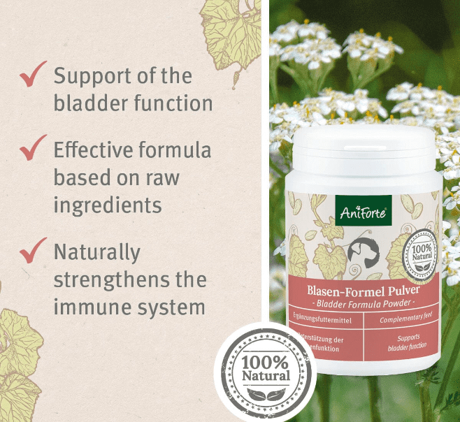 AniForte® Bladder Formula is a purely natural product based on important raw materials to support the immune system and the bladder function of your furry friend. In addition, the natural product has a positive effect on the normal function of the prostate in male dogs. Sensitive dogs that refuse to eat due to discomfort can be motivated with the appetite-stimulating properties of yarrow.