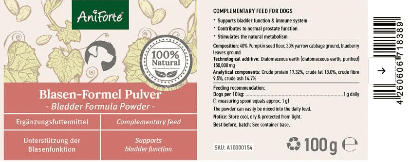 AniForte® Bladder Formula is a high quality and natural powder consisting of pumpkin seed flour, yarrow and other herbs. The finely tuned recipe supports your dog's bladder function and immune system in a natural way.